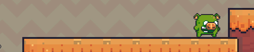 There is currently one type of enemy included in the kit - the evil piggy. When calm, piggy will patrol back and forth on whatever platform it's standing on. If the player is visible (in front of piggy, not above or below, and within range), piggy will enter an aggro state, turn red, and charge at the player. The player can kill the piggy by jumping on its head, and piggy can kill the player by touching the player in any other way.