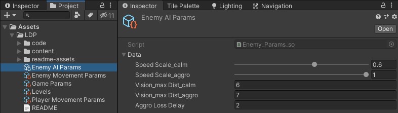 You can tune and adjust certain parameters like the player movement and enemy behaviour using the assets located in the main Assets folder.