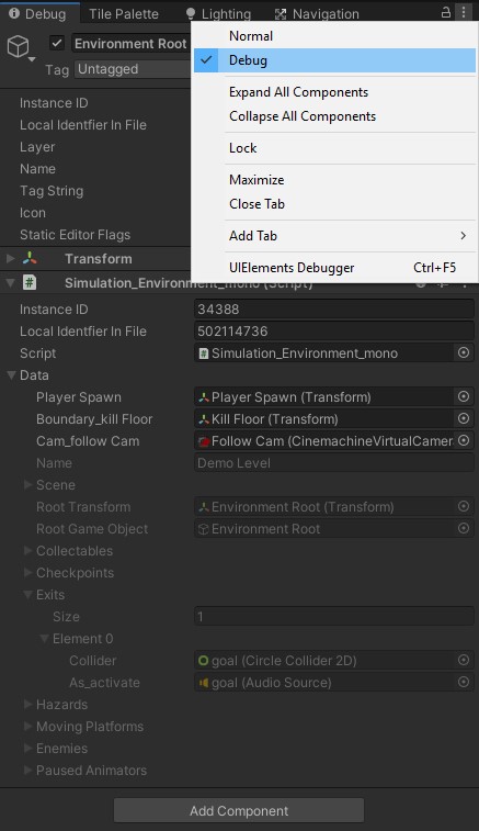 Every level scene must contain an object with a LevelRoot_mono component, and all other gameplay elements should be parented to this object. This object/component is used to link objects in the scene to the game code.