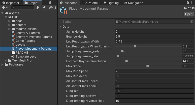 LDP is a 2D platforming game template created in Unity to be used as a sandbox for game design students and hobbyists to experiment with level design concepts without needing to program and build their own game. The project includes all of its source code, so it can also be extended and serve as a reference example of a fully working game, but the primary goal is for users to be able to design levels with minimal technical knowledge.