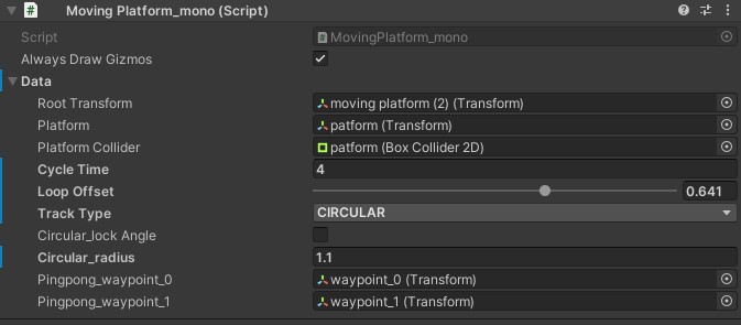 cycleTime controls the time it takes for the platform to make a full loop, and loopOffset controls the platform's initial position. You can select the movement mode using the exposed trackType enum, and there are variables exposed for each movement type with prefixes denoting the mode that they are used for (ie: circular_radius).
