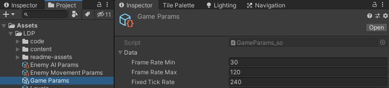 Frame timing options can be set in the Game Params asset found in the main Assets folder.