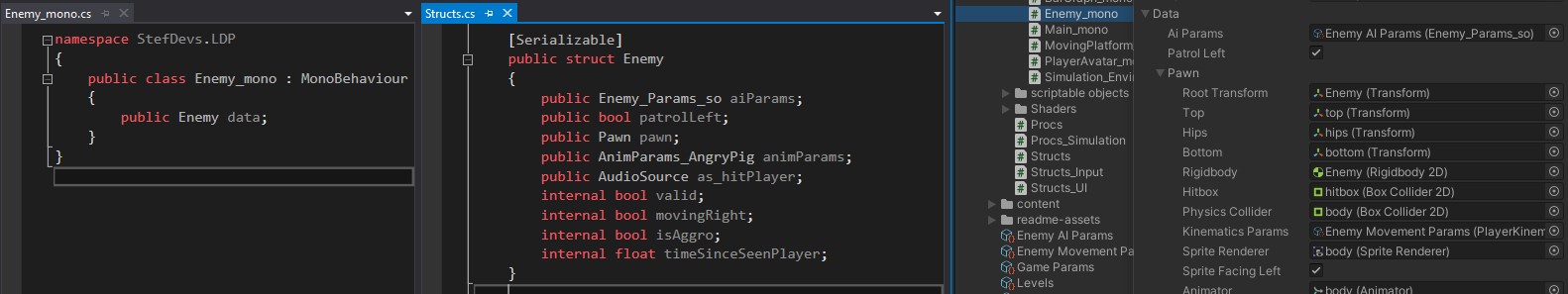 Most of the data structures in LDP are simple C# structs or classes; they do not inherit from Unity's classes (ie: monobehaviour) and thus don't interface directly with the Unity Editor or Runtime. In some situations where we want to expose data to the editor or represent an entity in the scene as a gameobject, the LDP struct is wrapped in a monobehaviour or scriptable object. These wrapper classes are denoted with suffixes like _mono or _so.
